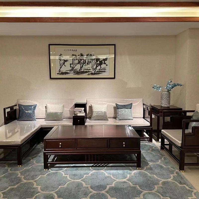 Ce nouveau canapé de salon en ébène de style chinois est un chef-d'œuvre qui incarne l'artisanat et l'esthétique et s'inscrit dans le nouveau style chinois. Nous avons fourni une personnalisation complète de style chinois à des milliers de clients, depuis la décoration dure + la personnalisation du travail en bois dans toute la maison + l'assortiment de meubles en acajou pour toute la maison + l'assortiment de décoration douce.